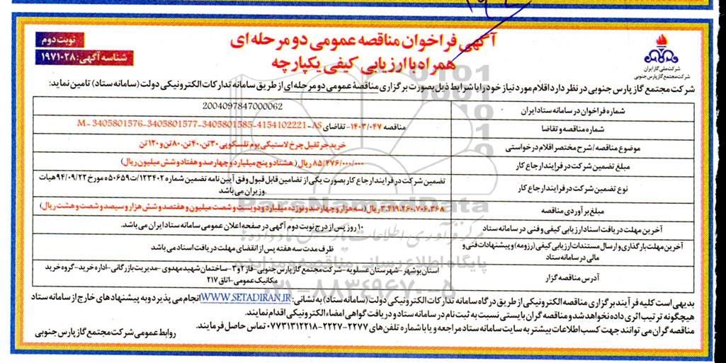 شرکت مجتمع گاز پارس جنوبی در نظر دارد اقلام مورد نیاز خود را با شرایط ذیل بصورت برگزاری مناقصه عمومی دو مرحله ای از طریق سامانه تدارکات الکترونیکی دولت سامانه ستاد تامین نماید