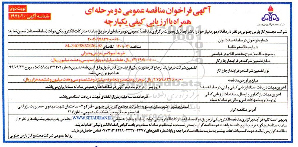 شرکت مجتمع گاز پارس جنوبی در نظر دارد اقلام مورد نیاز خود را با شرایط ذیل بصورت برگزاری مناقصه عمومی دو مرحله ای از طریق سامانه تدارکات الکترونیکی دولت سامانه ستاد تامین نماید