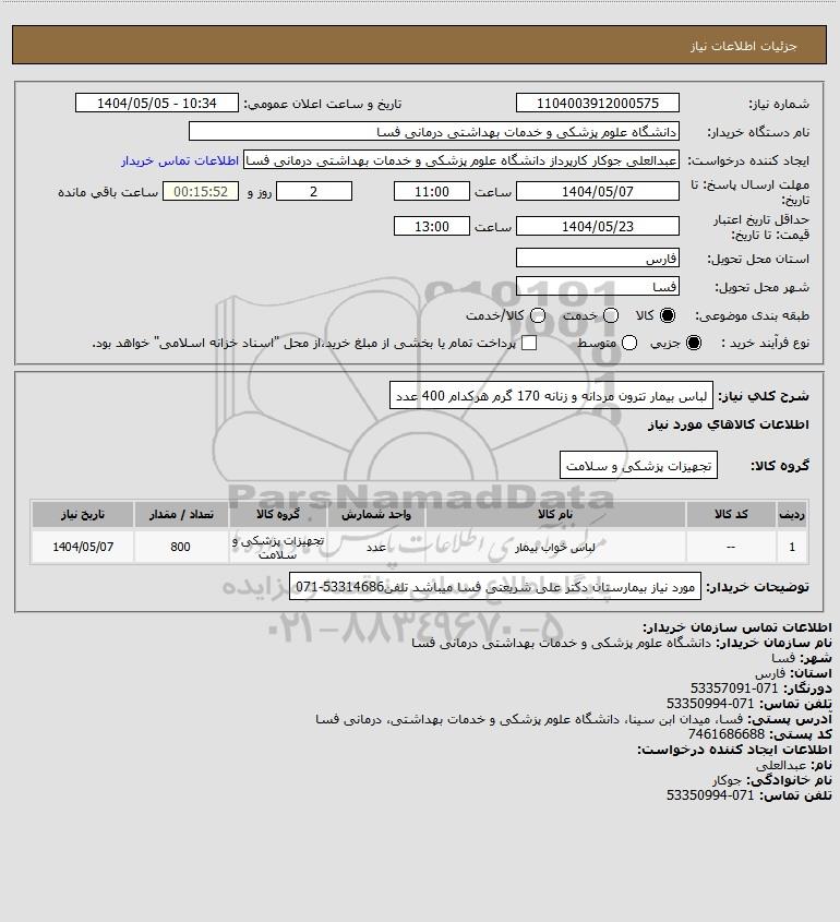 شرح کلی نیاز: لباس بیمار تترون مردانه و زنانه 170 گرم هرکدام 400 عدد