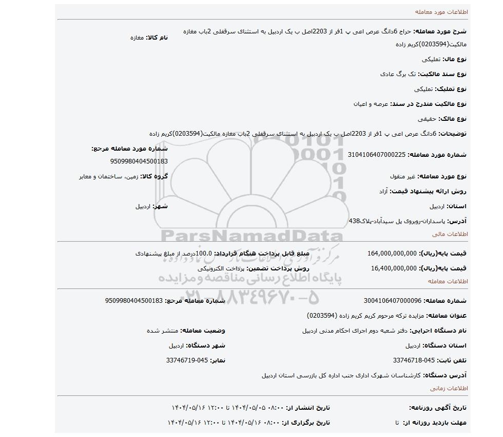 شرح مورد معامله: حراج 6دانگ عرص اعی پ 1فر از 2203اصل ب یک اردبیل به استثنای سرقفلی 2باب مغازه مالکیت(0203594)کریم زادهنام کالا: مغازه