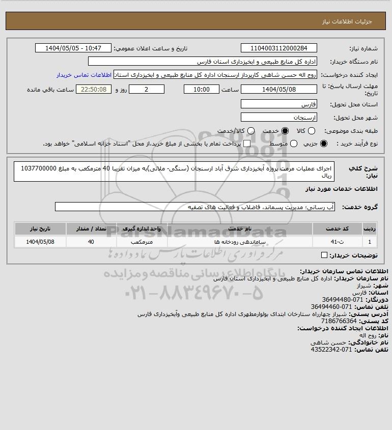 شرح کلی نیاز: اجرای عملیات مرمت پروژه آبخیزداری شرق آباد ارسنجان (سنگی- ملاتی)به میزان تقریبا 40 مترمکعب به مبلغ 1037700000 ریال
