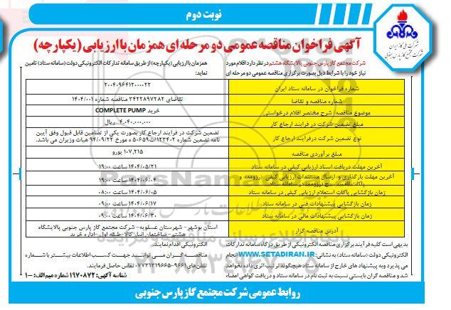 موضوع مناقصه / شرح مختصر اقلام درخواستی: خرید COMPLETE PUMP