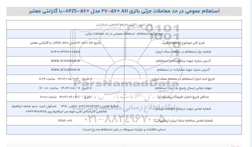 شرح کلی موضوع استعلام خرید: باتری 560AH - 27 مدل 8PZS - 560 با گارانتی معتبر