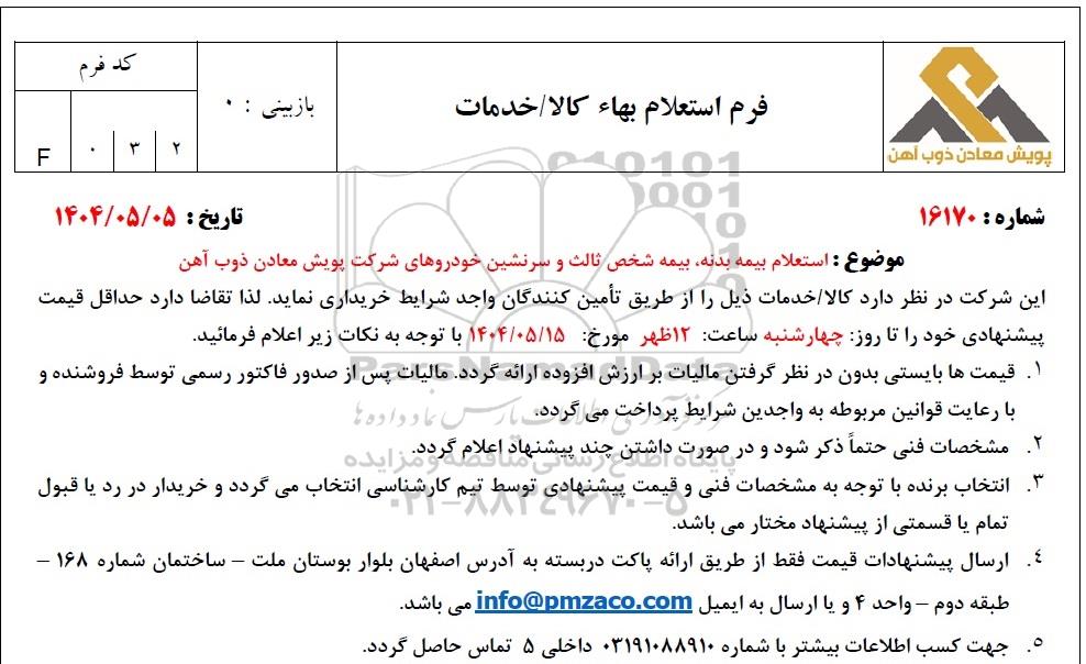 موضوع : استعلام بیمه بدنه، بیمه شخص ثالث و سرنشین خودروهای شرکت پویش معادن ذوب آهن