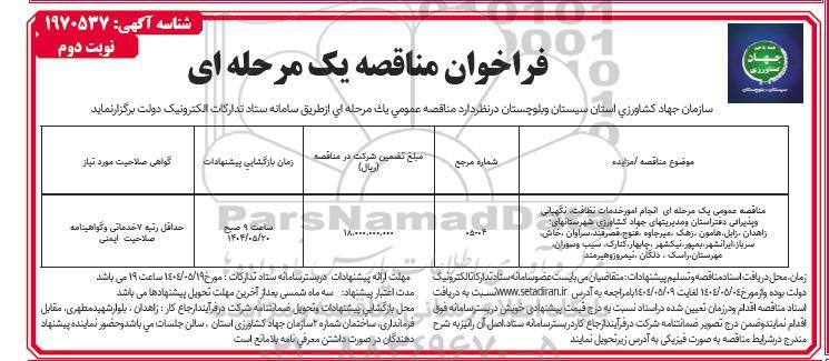1 مناقصه عمومی یک مرحله ای انجام امور خدمات نظافت، نگهبانی و پذیرائی دفتر استان و مدیریت های جهاد کشاورزی شهرستانهای: زاهدان ، زابل، هامون ، زهک ، میرجاوه، فنوج، قصرقند، سراوان ، خاش، سرباز، ایرانشهر بمپور، نیکشهر ، چابهار ، کنارک، سیب و سوران مهرستان، راسک ، دلگان، نیمروز و هیرمند 04-05 18.000.000.000 ساعت 9 صبح مورخ 1404.5.20 حداقل رتبه 7 خدماتی و گواهی نامه صلاحیت ایمنی