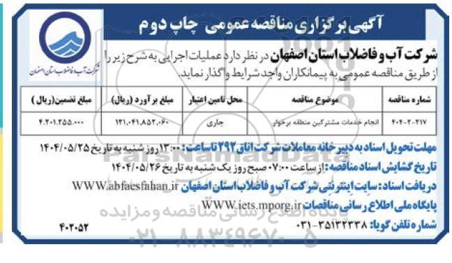 شرکت آب و فاضلاب استان اصفهان در نظر دارد عملیات اجرایی به شرح زیر را از طریق مناقصه عمومی به پیمانکاران واجد شرایط واگذار نماید.