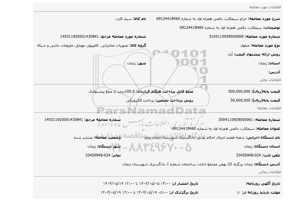 | شرح مورد معامله: حراج سیمکارت دائمی همراه اول به شماره 09124418460 | نام کالا: سیم کارت | |