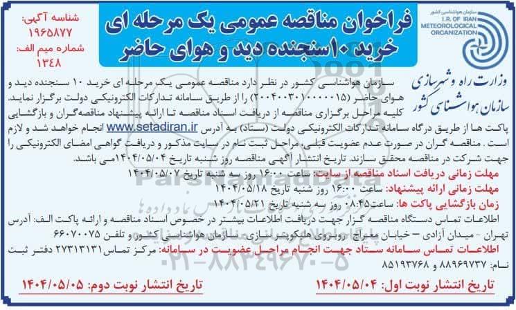 فراخوان مناقصه خرید 10 سنجنده دید و هوای حاضر نوبت دوم , فراخوان مناقصه خرید 10 سنجنده دید و هوای حاضر نوبت دوم