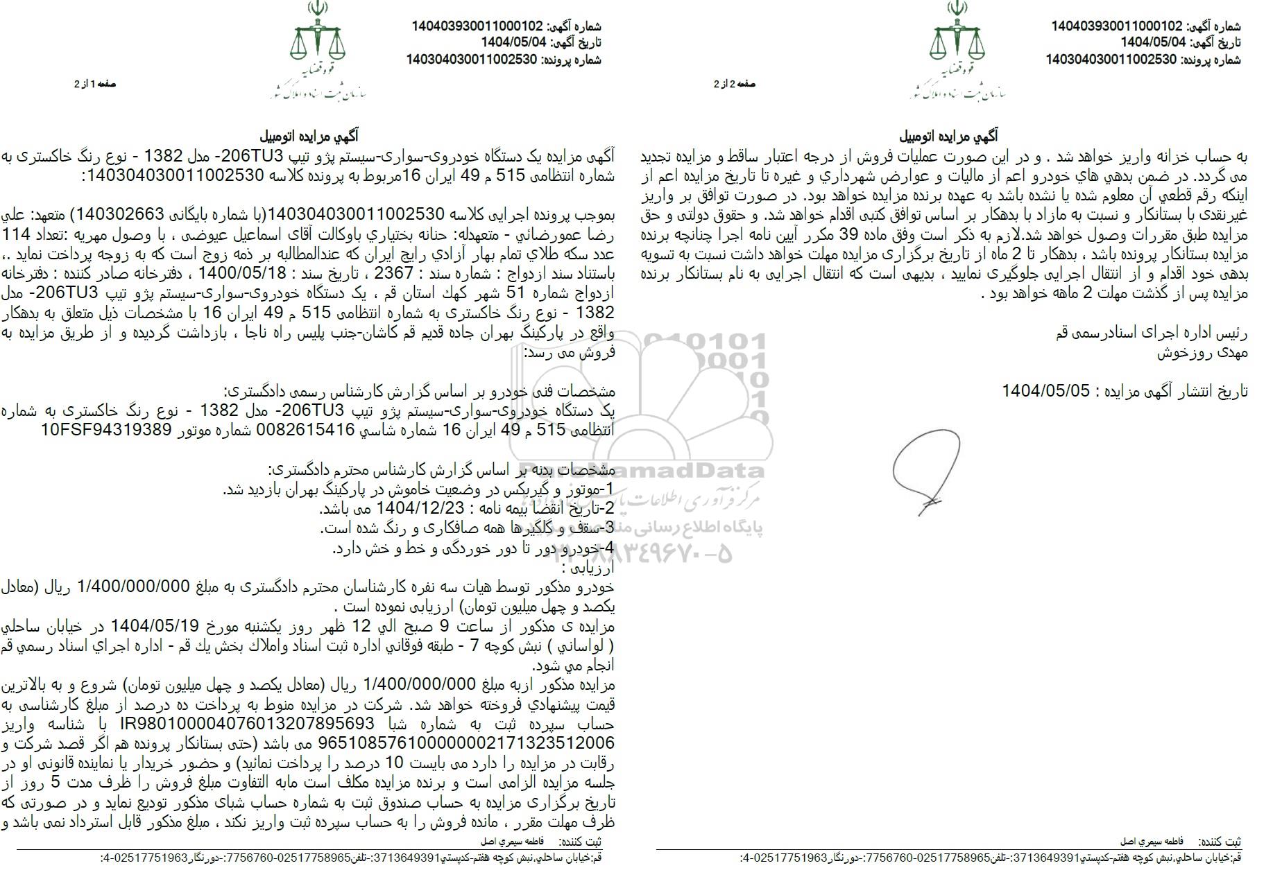 مزایده یک دستگاه خودرو پژو 206 مدل 1382