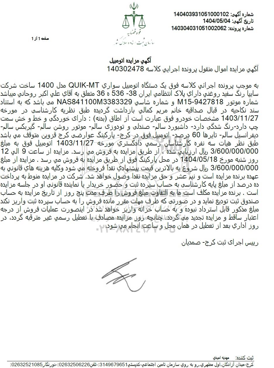 مزایده عمومی مزایده فروش یک دستگاه QUIK-MT برگزار میگردد. از کلیه افراد متخصص و شرکتهای واجد شرایط دعوت به عمل میآید تا در این مزایده با کد خبرگزاری پارس نماد : 9327373 شرکت نمایند تاریخ شروع مزایده : 1404/05/05 مهلت شرکت در مزایده: تا پایان روز 1404/05/18 مکان برگزاری اموال واگذاری استانهای البرز و دستهبندیهای مربوط به این حراجی انواع خودرو سبک میباشد.