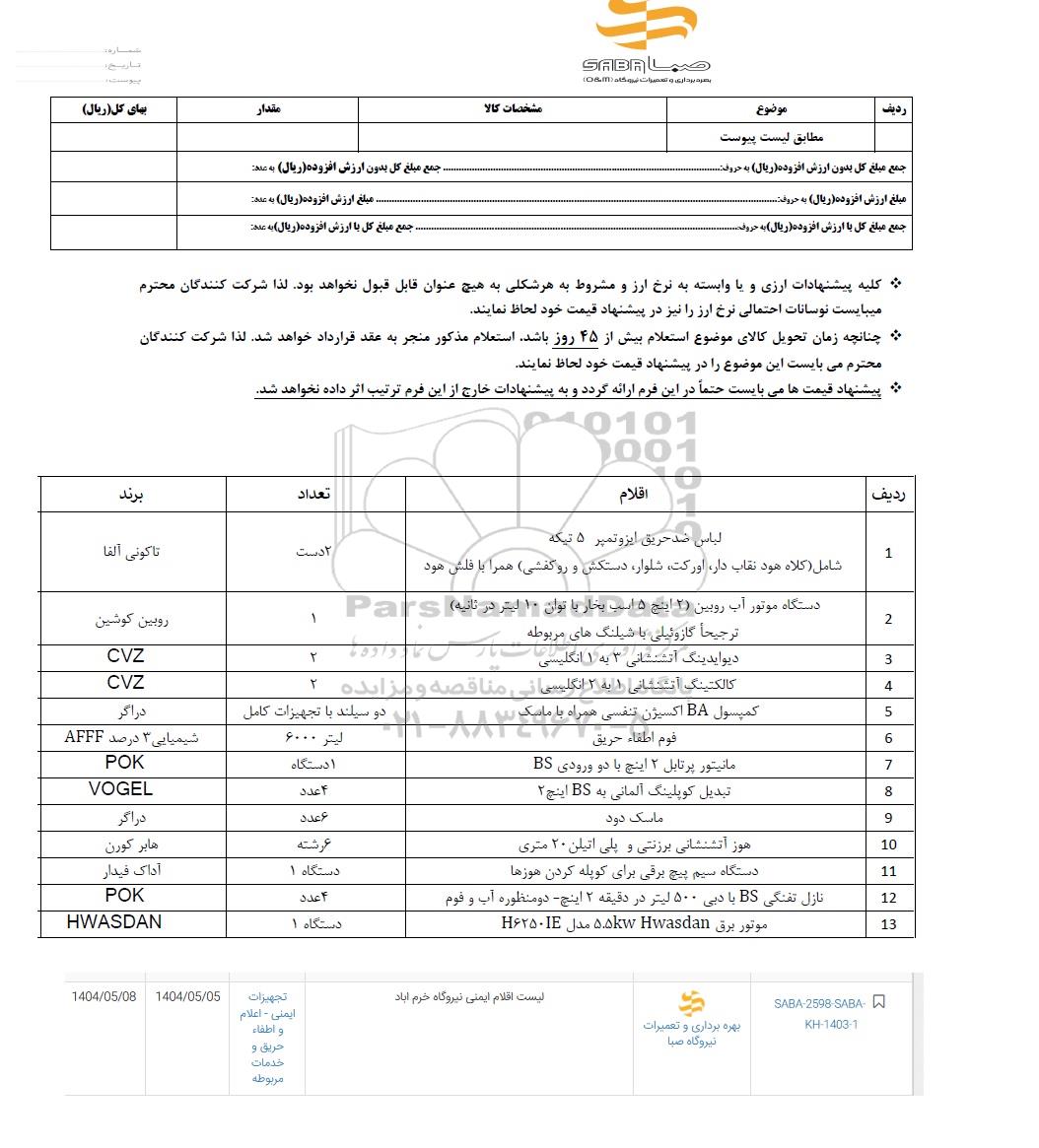 | SABA - 2598 - SABA - KH - 1403 - 1 | بهره برداری و تعمیرات نیروگاه صبا | لیست اقلام ایمنی نیروگاه خرم آباد | تجهیزات ایمنی - اعلام و اطفاء حریق و خدمات مربوطه | 1404.05.05 | 1404.05.08 |