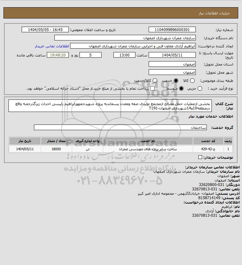 شرح کلی نیاز: بخشی ازعملیات حمل مصالح ازمجتمع تولیدی صفه ومعدن پسماندبه پروژه شهیدجمهورابراهیم رئیسی احداث زیرگذرحصه واقع درمنطقه10و14شهرداری اصفهان-T191