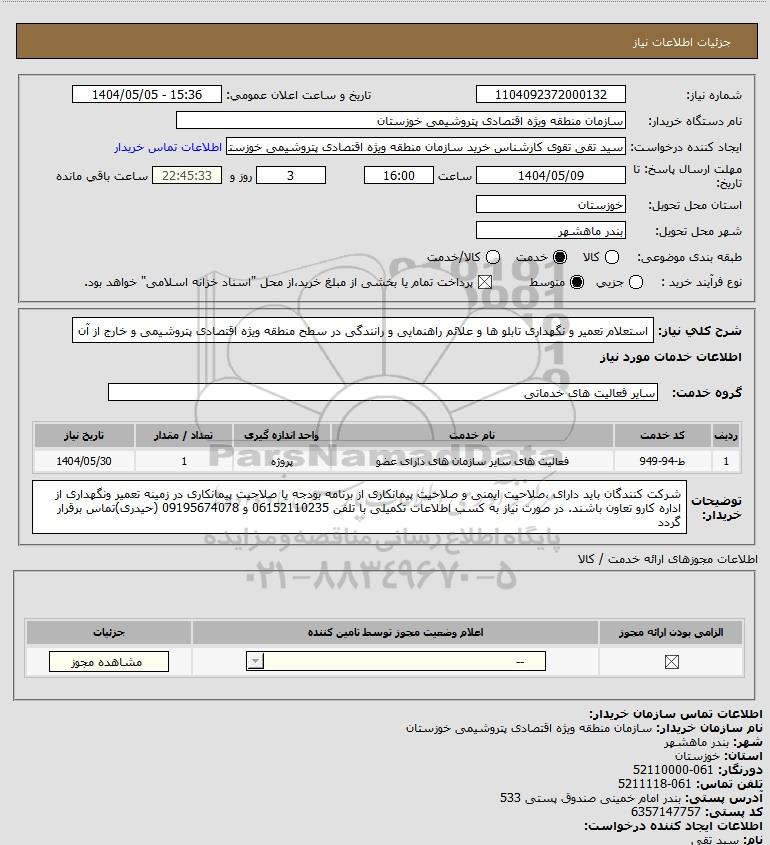 توضیحات خریدار:شرکت کنندگان باید دارای ،صلاحیت ایمنی و صلاحیت پیمانکاری از برنامه بودجه یا صلاحیت پیمانکاری در زمینه تعمیر ونگهداری از اداره کارو تعاون باشند. در صورت نیاز به کسب اطلاعات تکمیلی با تلفن 06152110235 و 09195674078 (حیدری)تماس برقرار گردد