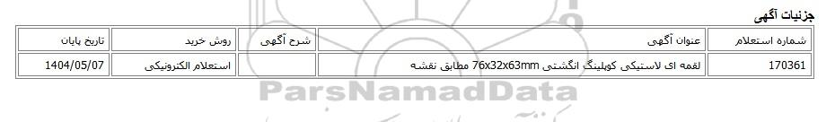 | 170361 | لقمه ای لاستیکی کوپلینگ انگشتی 76x32x63mm مطابق نقشه | استعلام الکترونیکی | 1404/05/07 |
