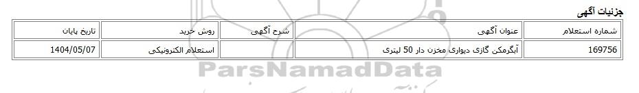 | 169756 | آبگرمکن گازی دیواری مخزن دار 50 لیتری | استعلام الکترونیکی | 1404/05/07 |