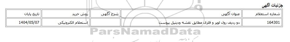 | 164301 | دو ردیف رول لوپر و فلزی مطابق نقشه ودیتیل پیوست | استعلام الکترونیکی | 1404/05/07 |