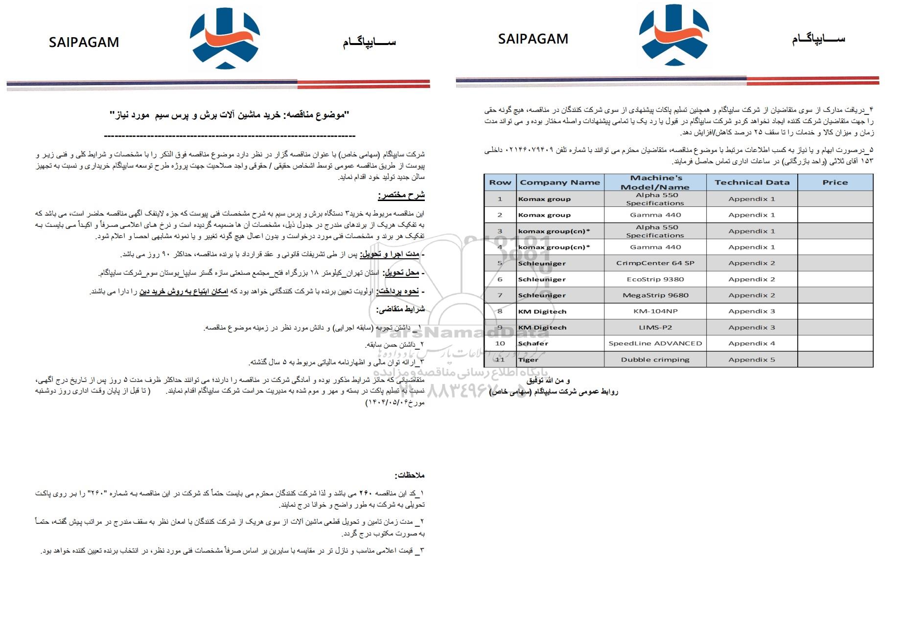مناقصه: خرید ماشین آلات برش و پرس سیم مورد نیاز از کلیه افراد متخصص و شرکتها واجد شرایط دعوت به عمل میآید در مناقصه با کد خبرگزاری پارس نماد: 9328209 شرکت نمایند.