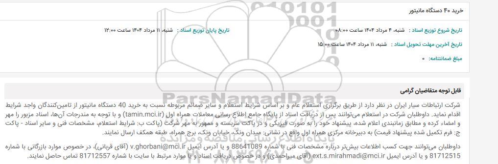 شرکت ارتباطات سیار ایران در نظر دارد از طریق برگزاری استعلام عام و بر اساس شرایط استعلام و سایر ضمائم مربوطه نسبت به خرید 40 دستگاه مانیتور از تامین‌کنندگان واجد شرایط اقدام نماید. داوطلبان شرکت در استعلام می‏‌توانند پس از دریافت اسناد از پایگاه جامع اطلاع رسانی معاملات همراه اول (tamin.mci.ir) و با توجه به مندرجات آن‌ها، اسناد مزبور را مهر و امضاء کرده و مطابق زمانبندی اعلام شده، پیشنهاد خود را به صورت فیزیکی و در پاکت سربسته و ممهور به مهر شرکت (پاکت ب: شرایط استعلام، مشخصات فنی و سایر اسناد - پاکت ج: فرم تکمیل شده پیشنهاد قیمت) به دبیرخانه مرکزی همراه اول واقع در نشانی: میدان ونک، خیابان ونک، برج همراه، طبقه همکف ارسال نمایند.