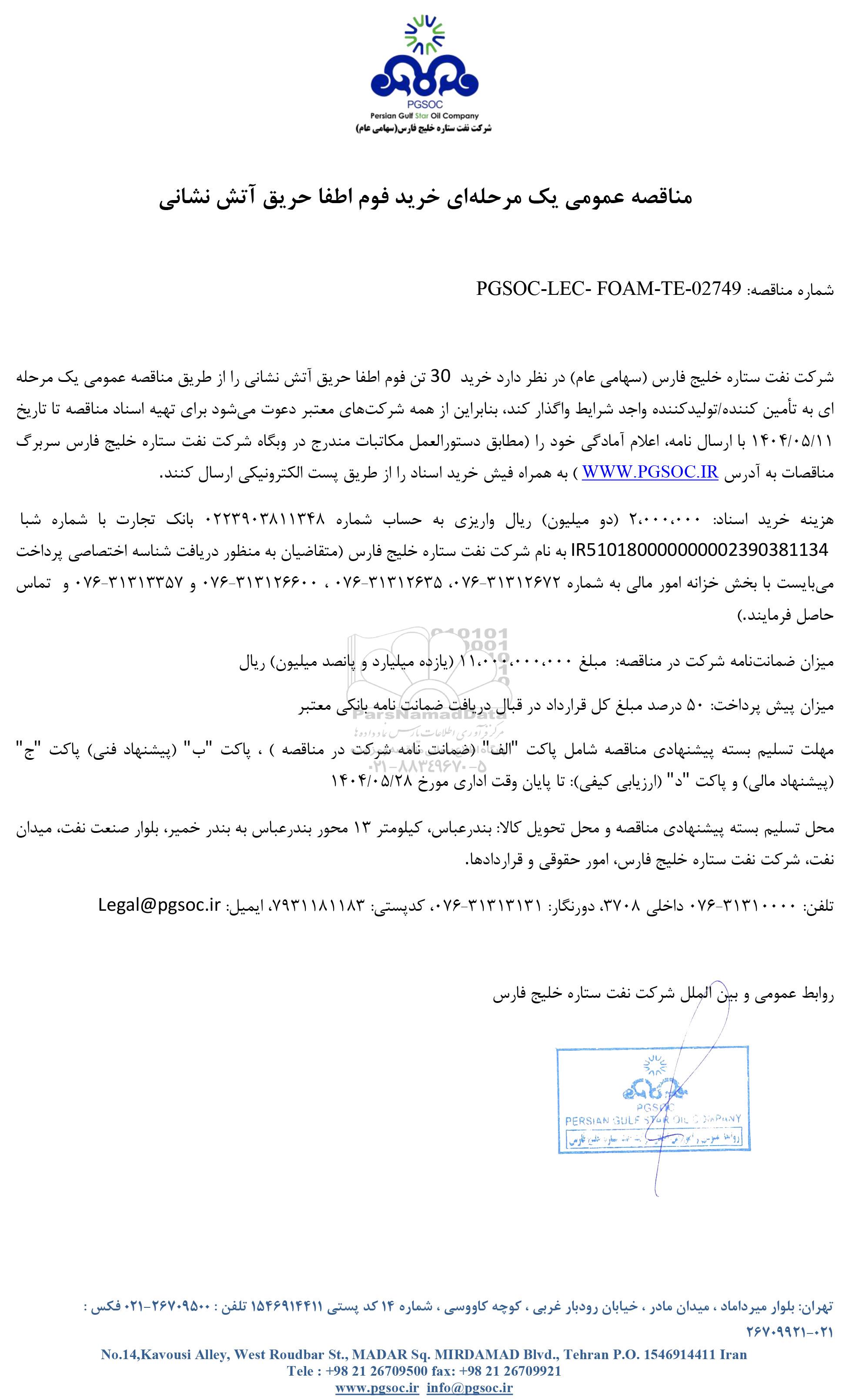 شماره مناقصه: PGSOC-LEC- FOAM-TE- 02749