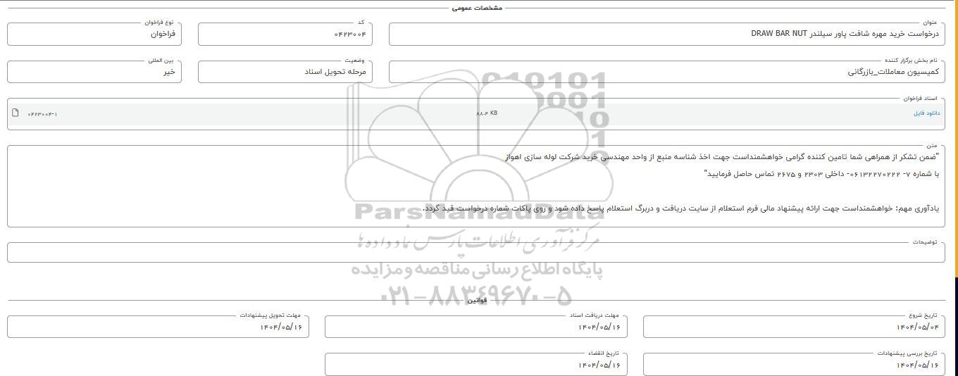 تاریخ بررسی پیشنهادات: 1404.05.16 - تاریخ انقضاء: 1404.05.16