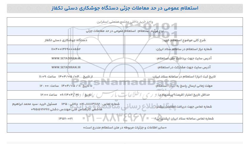 استعلام عمومی در حد معاملات جزئی دستگاه جوشکاری دستی تکفاز