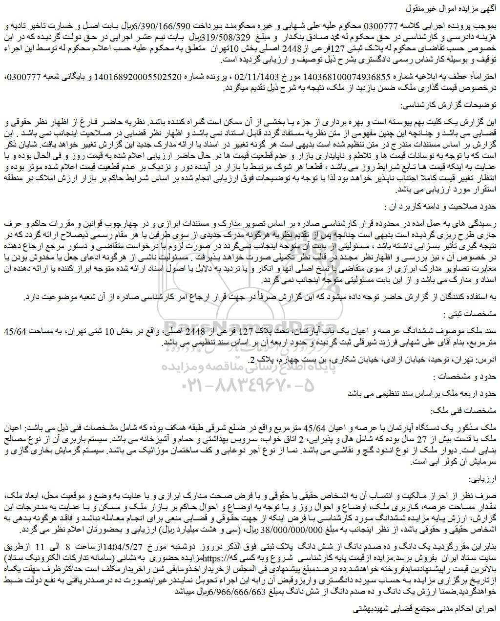 بموجب پرونده اجرایی کلاسه 0300777 محکوم علیه علی شهابی و غیره محکومند بپرداخت 6/390/166/590ریال بابت اصل و خسارت تاخیر تادیه و هزینه دادرسی و کارشناسی در حق محکوم له محمد صادق بنکدار و مبلغ 319/508/329ریال بابت نیم عشر اجرایی در حق دولت گردیده که در این خصوص حسب تقاضای محکوم له پلاک ثبتی 127فرعی از2448 اصلی بخش 10تهران متعلق به محکوم علیه حسب اعلام محکوم له توسط این اجراء توقیف و بوسیله کارشناس رسمی دادگستری بشرح ذیل توصیف و ارزیابی گردیده است.