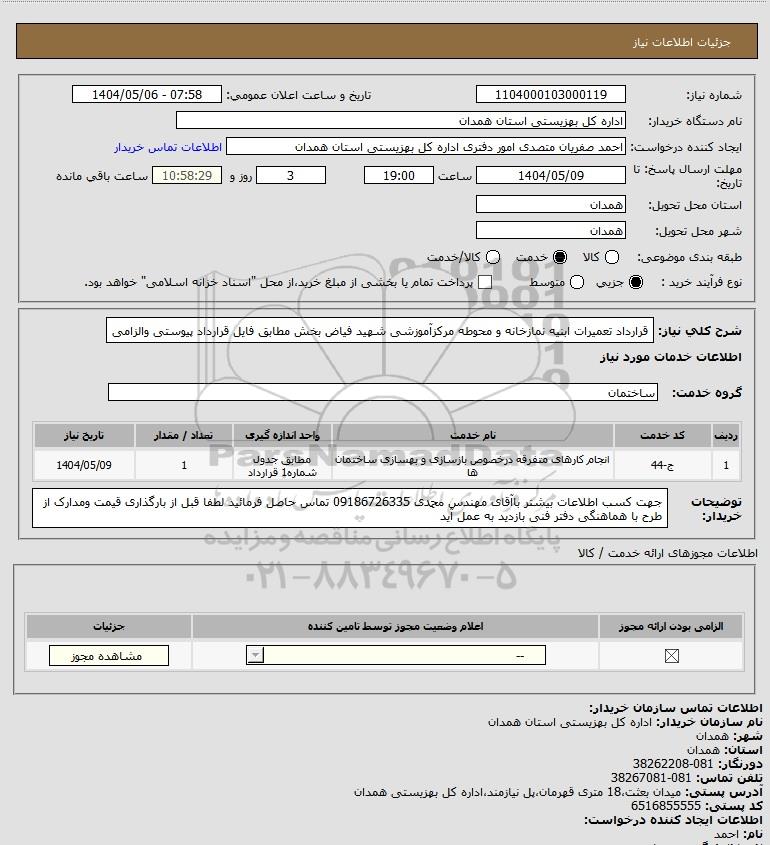 شرح کلی نیاز: قرارداد تعمیرات ابنیه نمازخانه و محوطه مرکزآموزشی شهید فیاض بخش مطابق فایل قرارداد پیوستی والزامی