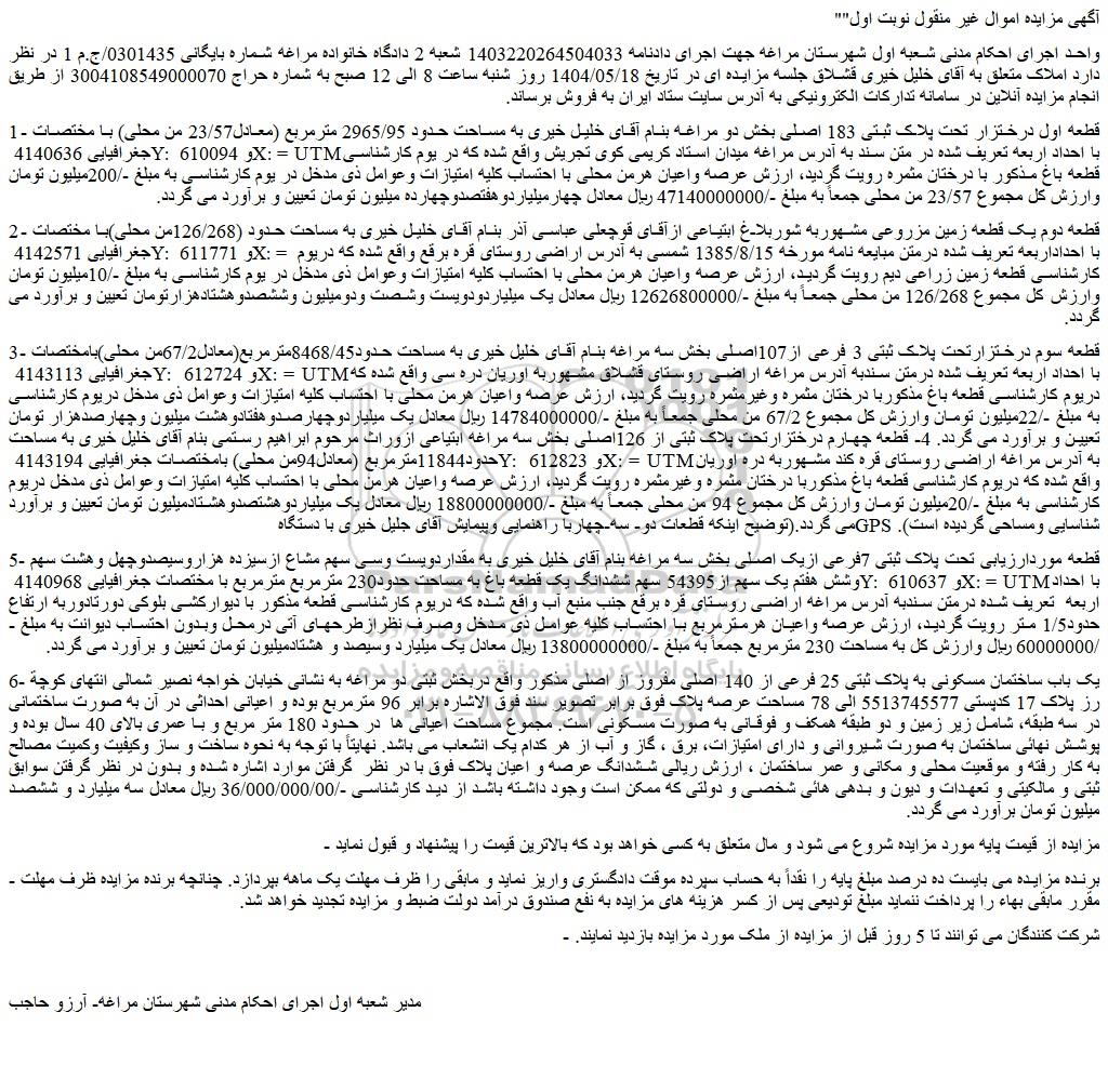 واحد اجرای احکام مدنی شعبه اول شهرستان مراغه جهت اجرای دادنامه 1403220264504033 شعبه 2 دادگاه خانواده مراغه شماره بایگانی 0301435/ج.م 1 در نظر دارد املاک متعلق به آقای خلیل خیری قشلاق جلسه مزایده ای در تاریخ 1404/05/18 روز شنبه ساعت 8 الی 12 صبح به شماره حراج 3004108549000070 از طریق انجام مزایده آنلاین در سامانه تدارکات الکترونیکی به آدرس سایت ستاد ایران به فروش برساند.