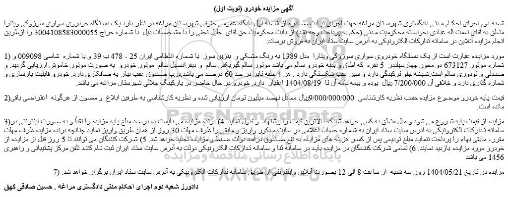 شعبه دوم اجرای احکام مدنی دادگستری شهرستان مراغه جهت اجرای نیابت صادره از شعبه اول دادگاه عمومی حقوقی شهرستان مراغه در نظر دارد یک دستگاه خودروی سواری سوزوکی ویتارا متعلق به آقای نعمت اله عبادی بخواسته محکومیت مدنی (حکم به پرداخت وجه نقد) از بابت محکومیت حق آقای خلیل نجفی را با مشخصات ذیل با شماره حراج 3004108583000055 را ازطریق انجام مزایده آنلاین در سامانه تدارکات الکترونیکی به آدرس سایت ستاد ایران به فروش برساند: