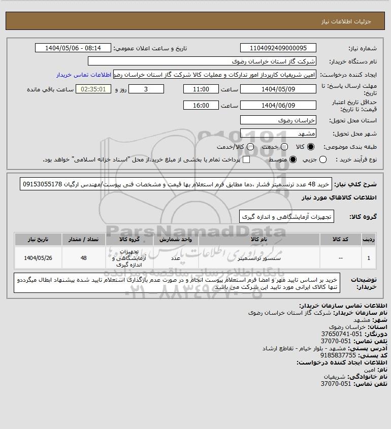 شرح کلی نیاز: خرید 48 عدد ترنسمیتر فشار ،دما مطابق فرم استعلام بها قیمت و مشخصات فنی پیوست/مهندس ارگیان 09153055178