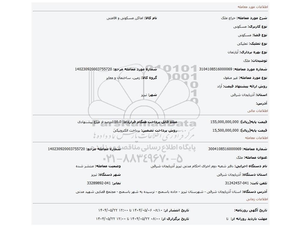 | شرح مورد معامله: حراج ملک | نام کالا: اماکن مسکونی و اقامتی | |