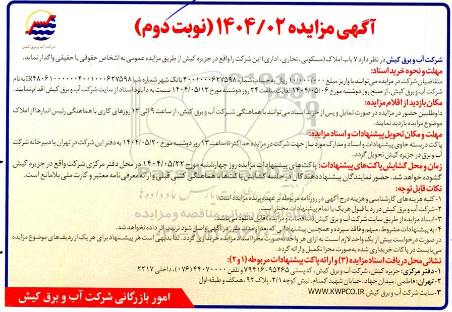 شرکت آب و برق کیش درنظر دارد 7 باب املاک (مسکونی، تجاری، اداری) این شرکت را واقع در جزیره کیش از طریق مزایده عمومی به اشخاص حقوقی یا حقیقی واگذار نماید