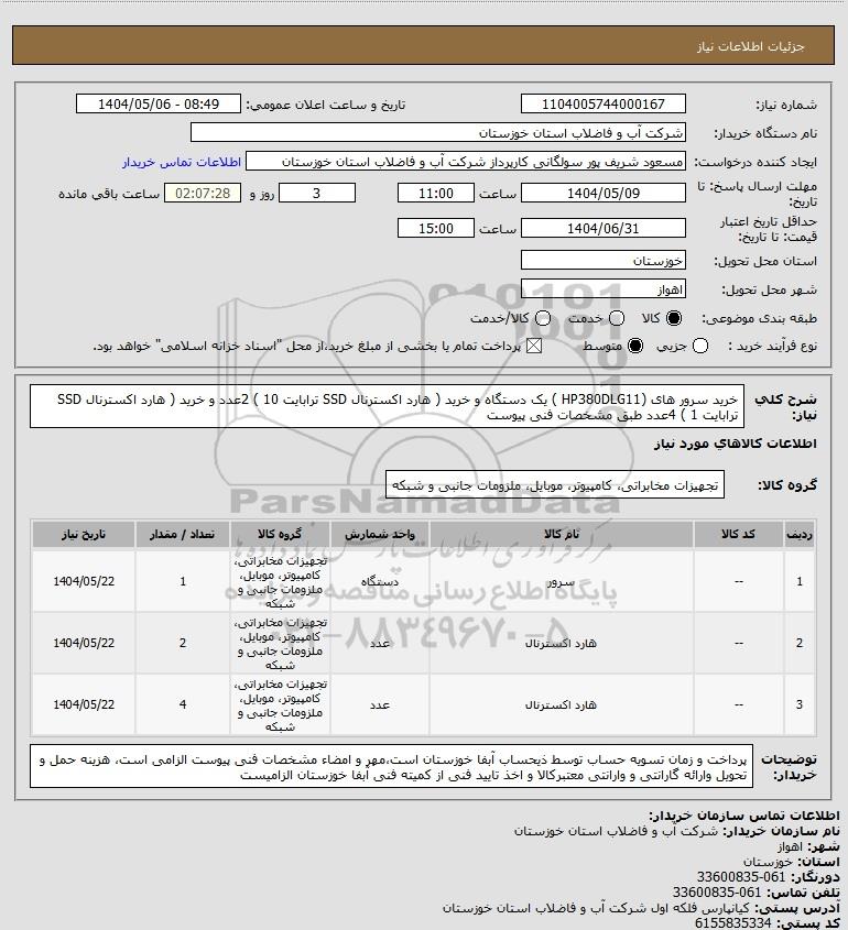 شرح کلی نیاز: خرید سرور های (HP380DLG11 ) یک دستگاه و خرید ( هارد اکسترنال SSD ترابایت 10 ) 2عدد و خرید ( هارد اکسترنال SSD ترابایت 1 ) 4عدد طبق مشخصات فنی پیوست