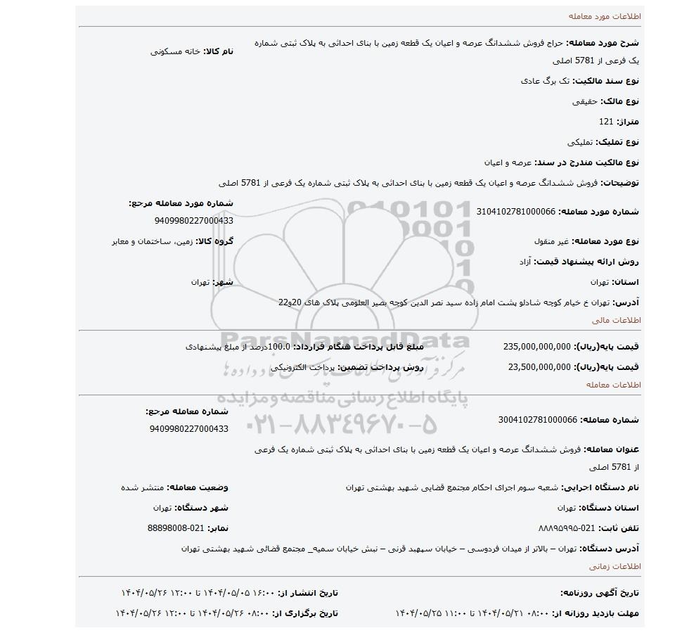 | شماره مورد معامله: 3104102781000066 | شماره مورد معامله مرجع: 9409980227000433 | |