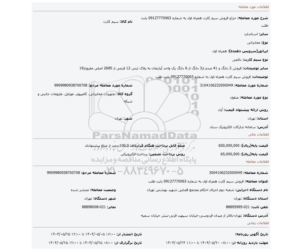 | عنوان معامله: فروش سیم کارت همراه اول به شماره 09127770063 بابت طلب | ||