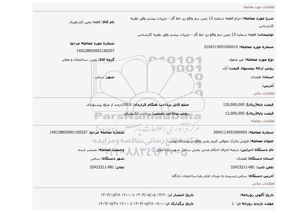| شرح مورد معامله: حراج قطعه شماره 13 زمین دیم واقع زیر خط گاز - جزییات بیشتر وفق نظریه کارشناس | نام کالا: قطعه زمین کشاورزی | |
