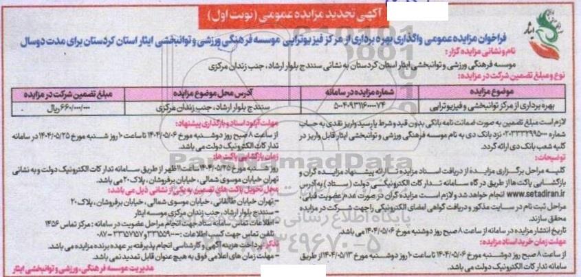 فراخوان مزایده عمومی واگذاری بهره برداری از مرکز توانبخشی و فیزیوتراپی موسسه فرهنگی ورزشی و توانبخشی ایثار استان کردستان برای مدت دو سال