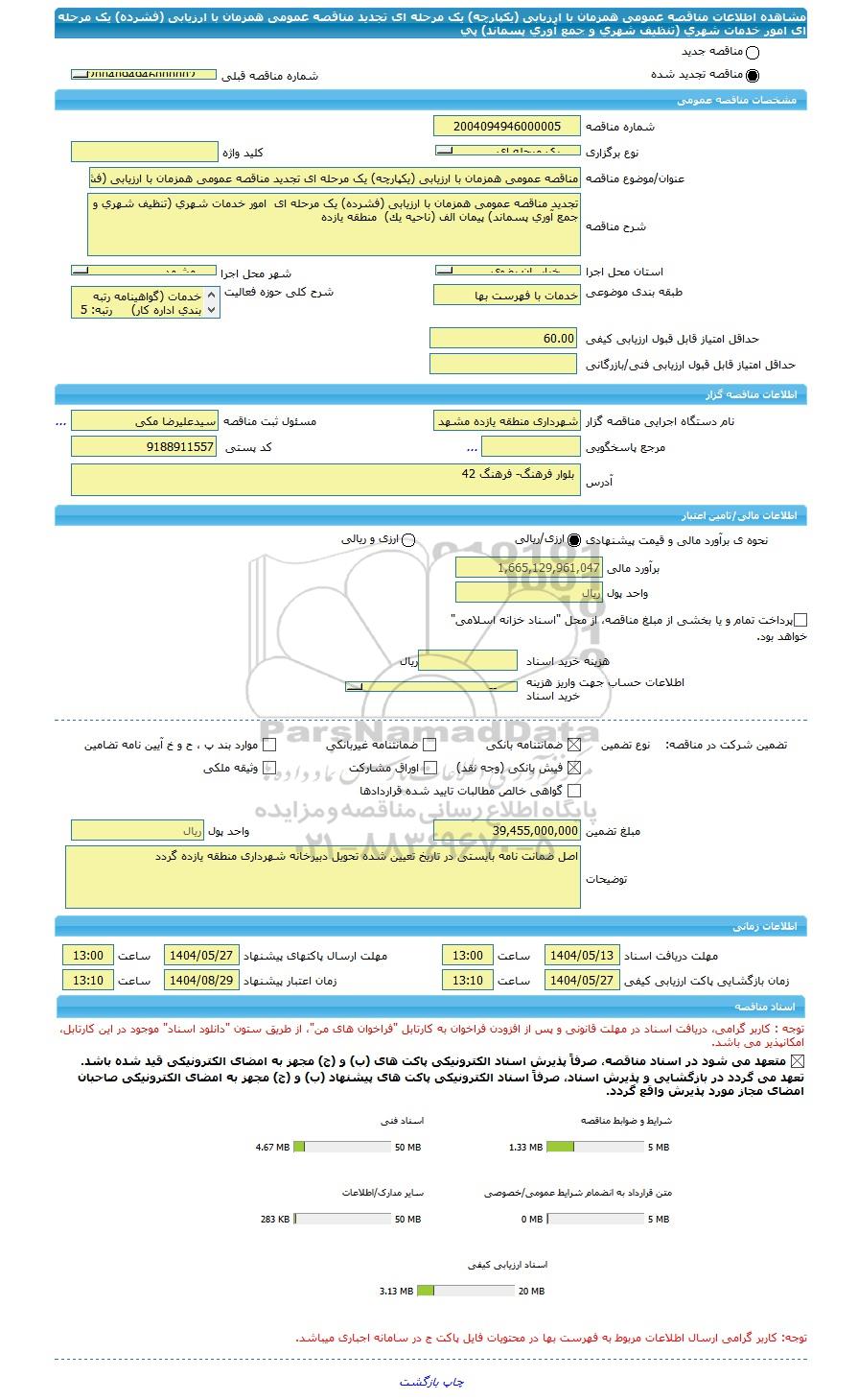 | عنوان/موضوع مناقصه | مناقصه عمومی همزمان با ارزیابی (یکپارچه) یک مرحله ای تجدید مناقصه عمومی همزمان با ارزیابی (فشرده) یک مرحله ای امور خدمات شهری (تنظیف شهری و جمع آوری پسماند) پی | ||