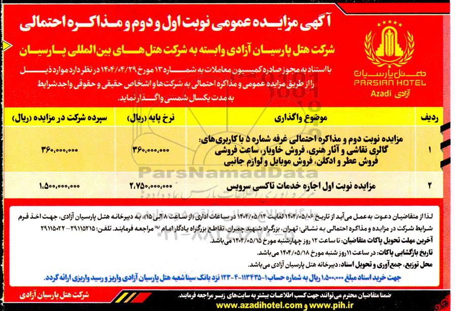 شرکت هتل پارسیان آزادی وابسته به شرکت هتلهای بین المللی پارسیان با استناد به مجوزهای صادره کمیسیون معاملات به شماره 13 مورخ 1404.4.29 در نظر دارد موارد ذیل را از طریق مزایده عمومی به شرکت ها و اشخاص حقیقی و حقوقی واجد شرایط به مدت یکسال واگذار نماید.