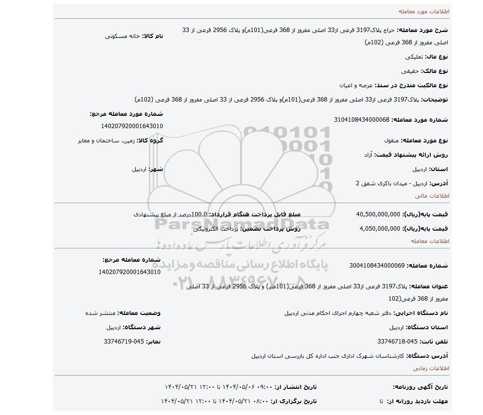 مزایده پلاک3197 فرعی از33 اصلی مفروز از 368 فرعی(101م)و پلاک 2956 فرعی از 33 اصلی مفروز از 368 فرعی (102م), مزایده، پلاک3197 فرعی از33 اصلی مفروز از 368 فرعی(101م)و پلاک 2956 فرعی از 33 اصلی مفروز از 368 فرعی (102م)