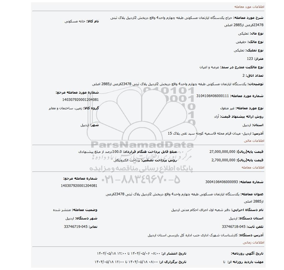 عنوان معامله: یکدستگاه اپارتمان مسکونی طبقه چهارم واحد4 واقع دربخش 2اردبیل پلاک ثبتی 23478فرعی از2885 اصلی