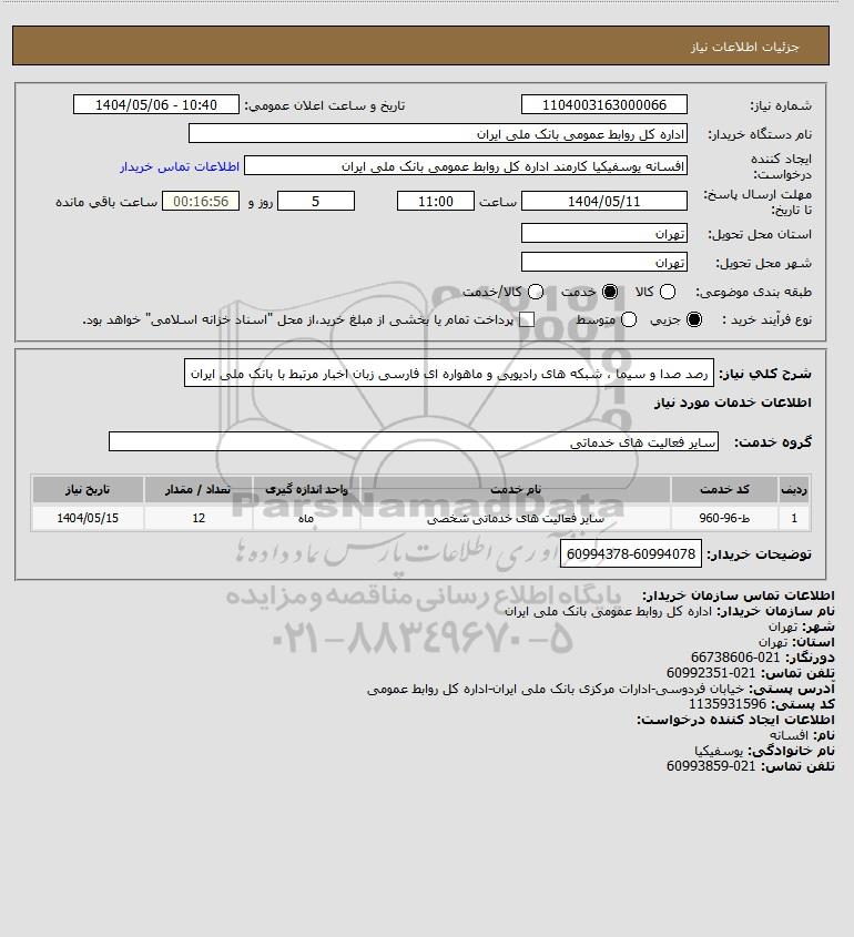 شرح کلی نیاز: رصد صدا و سیما ، شبکه های رادیویی و ماهواره ای فارسی زبان اخبار مرتبط با بانک ملی ایران