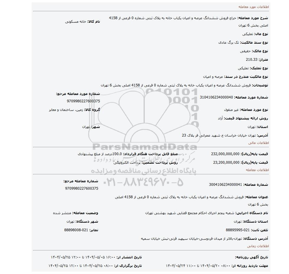 عنوان معامله: فروش ششدانگ عرصه و اعیان یکباب خانه به پلاک ثبتی شماره 0 فرعی از 4158 اصلی بخش 6 تهران