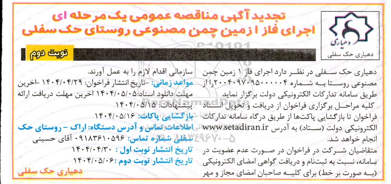 دهیاری حک سفلی در نظر دارد اجرای فاز 1 زمین چمن مصنوعی روستا به شماره 2004097095000004 را از طریق سامانه تدارکات الکترونیکی دولت برگزار نماید. کلیه مراحل برگزاری فراخوان از دریافت و تحویل اسناد فراخوان تا بازگشایی پاکتها از طریق درگاه سامانه تدارکات الکترونیکی دولت (ستاد) به آدرس سایت ستاد ایران انجام خواهد شد . متقاضیان شرکت در فراخوان در صورت عدم عضویت در سامانه نسبت به ثبت نام و دریافت گواهی امضای الکترونیکی به صورت بر خط) برای کلیه صاحبان امضای مجاز و مهر سازمانی اقدام لازم را به عمل آورند.