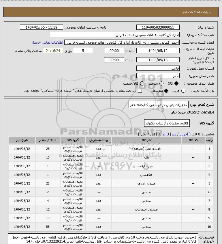 | 10 | -- | صندلی | عدد | اثاثیه، مبلمان و تزیینات دکوری | 56 | 1404/05/12 |