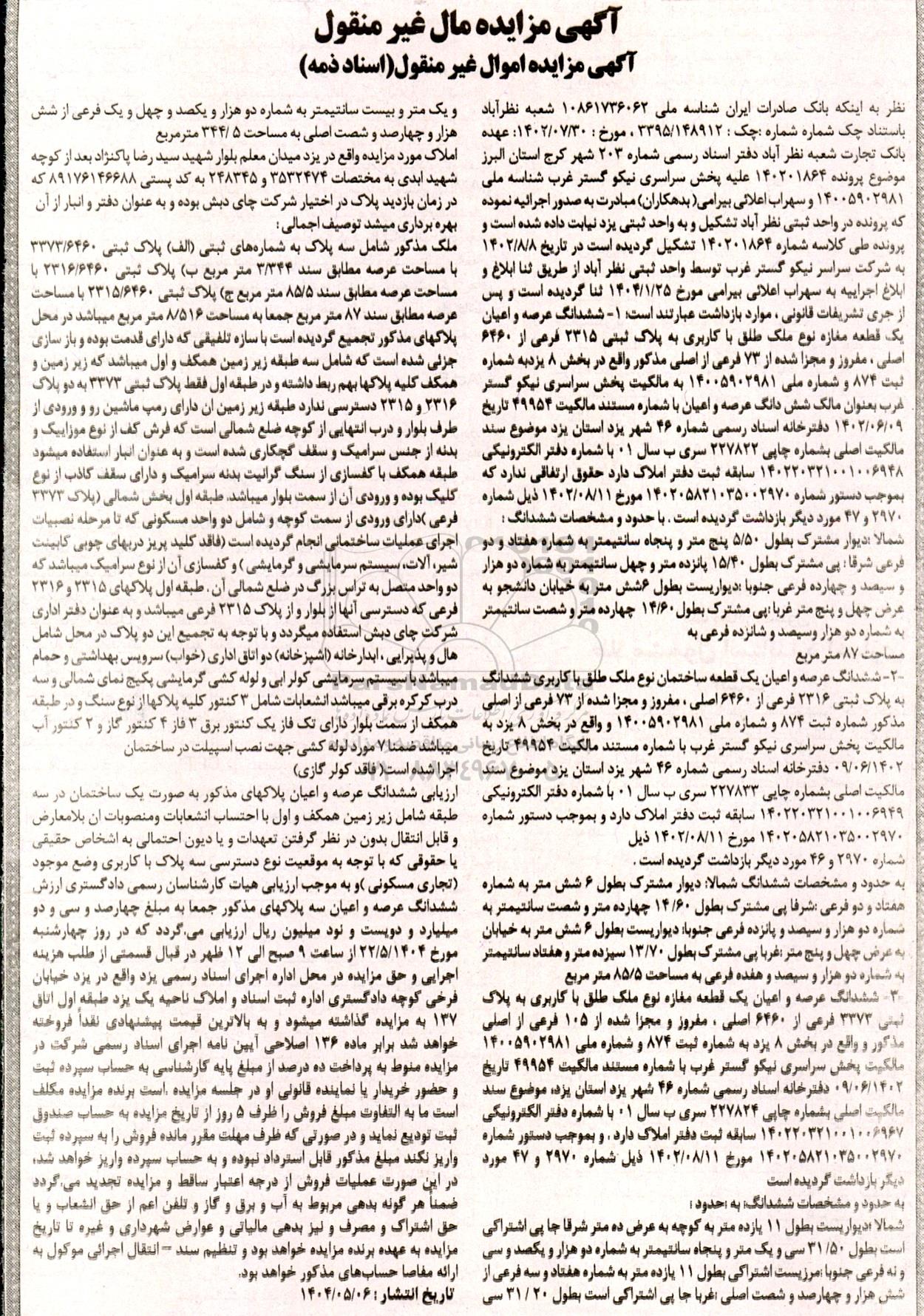 تمام آگهی ها طبق نمونه تصویر آگهی صرفا جهت اطلاع رسانی می باشد در خصوص استفاده از این آگهی هر گونه مسئولیت پرداخت به آگهی دهنده و بررسی و احراز هویت به عهده شرکت کنندگان می باشد و پایگاه خبری پارس نماد هیچگونه منفعت و مسئولیتی بابت تعهد این آگهی ندارد.