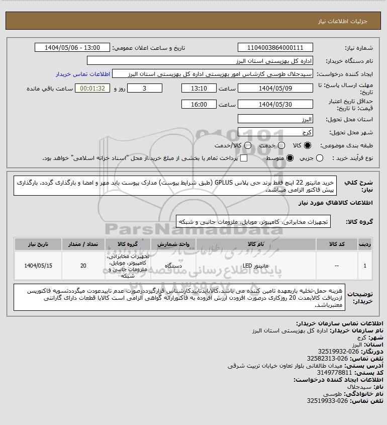 | 1 | -- | مانیتور LED | دستگاه | تجهیزات مخابراتی، کامپیوتر، موبایل، ملزومات جانبی و شبکه | 20 | 1404/05/15 |