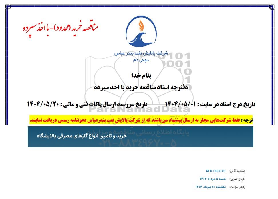 مناقصه خرید و تامین انواع گازهای مصرفی پالایشگاه از کلیه افراد متخصص و شرکتها واجد شرایط دعوت به عمل میآید در مناقصه با کد خبرگزاری پارس نماد: 9333341 شرکت نمایند.