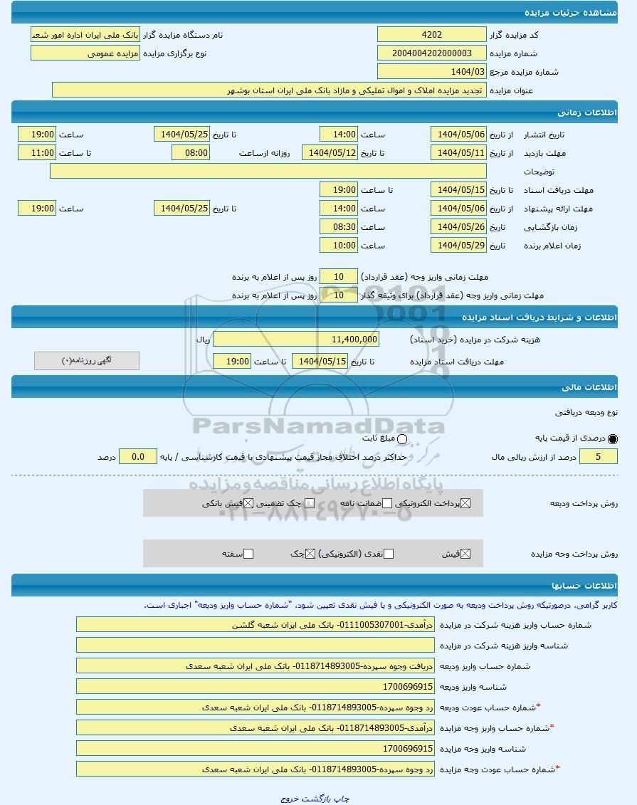 | شماره حساب عودت وجه مزایده | 1700696915 |