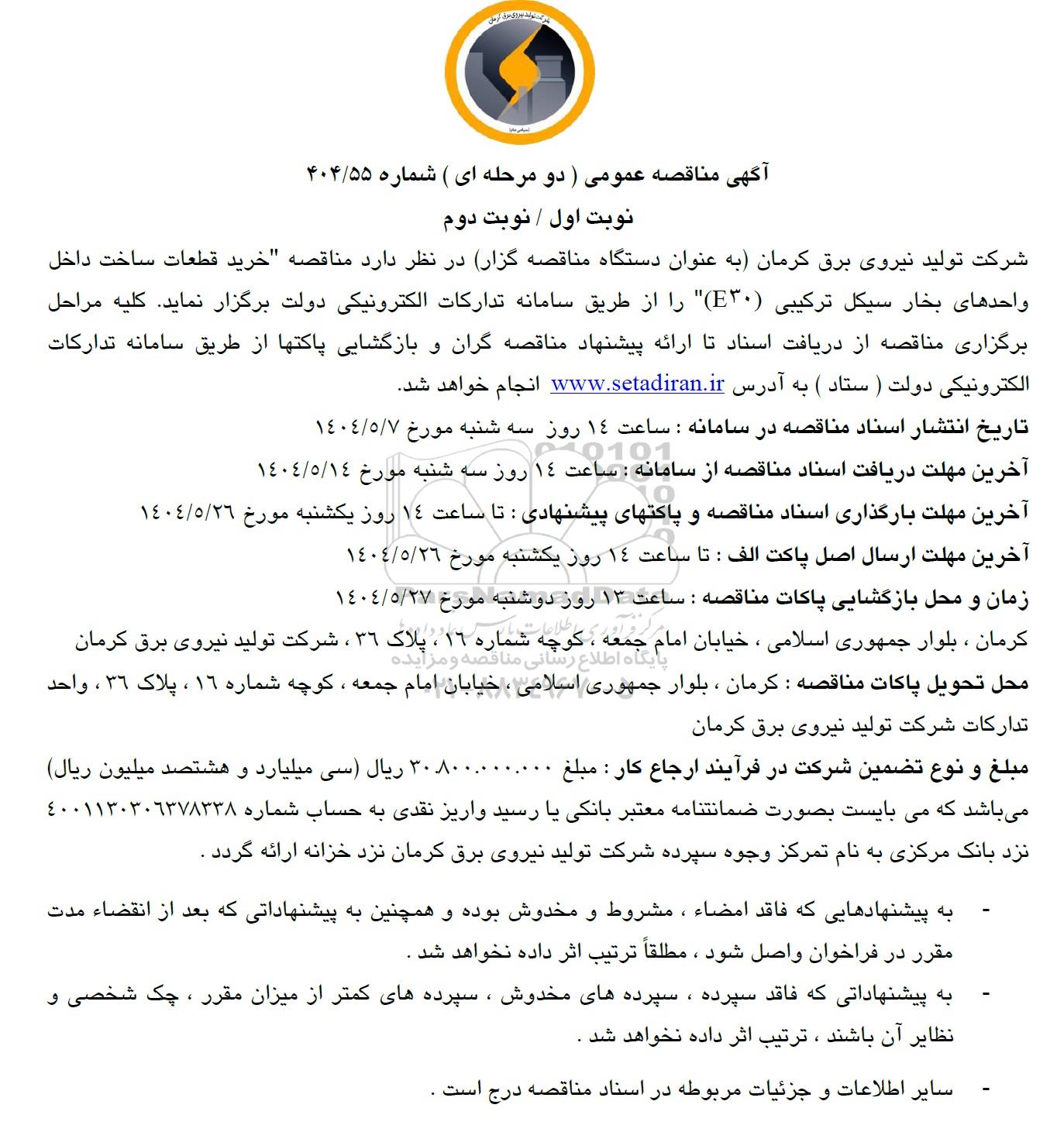 شرکت تولید نیروی برق کرمان (به عنوان دستگاه مناقصه گزار) در نظر دارد مناقصه "خرید قطعات ساخت داخل واحدهای بخار سیکل ترکیبی (E30)" را از طریق سامانه تدارکات الکترونیکی دولتبرگزار نماید. کلیه مراحل برگزاری مناقصه از دریافت اسناد تا ارائه پیشنهاد مناقصه گران و بازگشایی پاکتها از طریق سامانه تدارکات الکترونیکی دولت (ستاد ایران) انجام خواهد شد.
